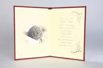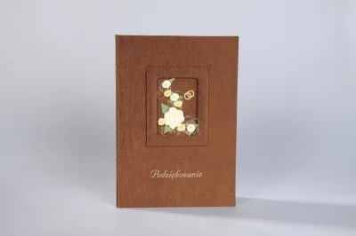 Przepiękne Podziękowanie dla Rodziców w kolorze brązowym, które będzie wspaniałym prezentem dla rodziców od Pary Młodej. Podziękowanie to jest pionowe o rozmiarze A4 z okienkiem o wymiarach: szer. 7cm i wys. 10cm.