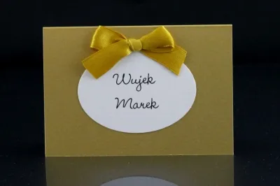 Winietka na stoł weselny, której podstawa wykonana jest z ozdobnego metalizowanego papieru. Rozmiar to 2 x 10 cm x 7 cm. Na podstawę winietki przyklejony jest biały papierw kształcie owali z nadrukiem gości. Całość dopełnia ozdobna wstążka w górnej części winietki.