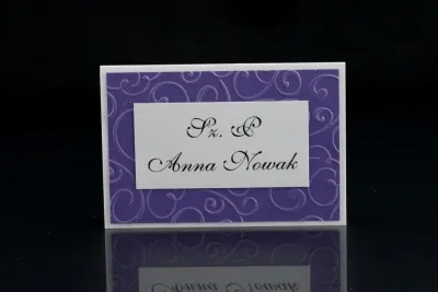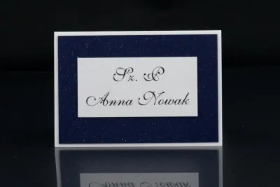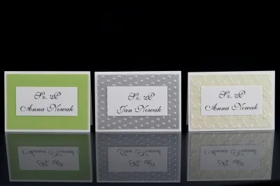 Winietka na stoł weselny, której podstawa wykonana zbiałego papieru. Rozmiar to 2 x 10 cm x 7 cm. Na podstawę winietki przyklejony jest kolorowy metalizowany papier z tłoczeniem lub bez. Na nim umieszczony jest biały papier z nadrukiem.