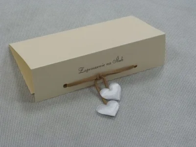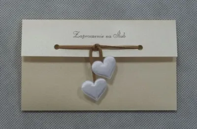 Proste i niezwykle eleganckie zaproszenie ślubne ręcznie robione poziome. Rozmiar po złożeniu to 15cm x 9xm. Wykonane zostało z ekskluzywnego metalizowanego papieru w kolorze kremowym. Po rozłożeniu zaproszenia posiada ono rozmiar 15 cm x 21cm. Ozdobą zaproszenia jest napis "Zaproszenia na ślub" oraz poniżej dwa białe serca - przywiązane do zaproszenia za pomocą rzemyka.
