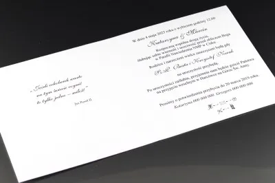 W środku wydrukowany jest tekst zaproszenia. Treść, krój czcionki oraz inne szczegóły ustalamy mailowo po złożeniu zamówienia. Następnie przygotowujemy projekt który wysyłamy Państwu do akceptacji.