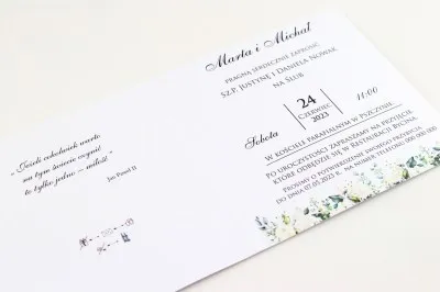 W środku wydrukowany jest tekst zaproszenia. Treść, krój czcionki oraz inne szczegóły ustalamy mailowo po złożeniu zamówienia. Następnie przygotowujemy projekt który wysyłamy Państwu do akceptacji.