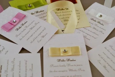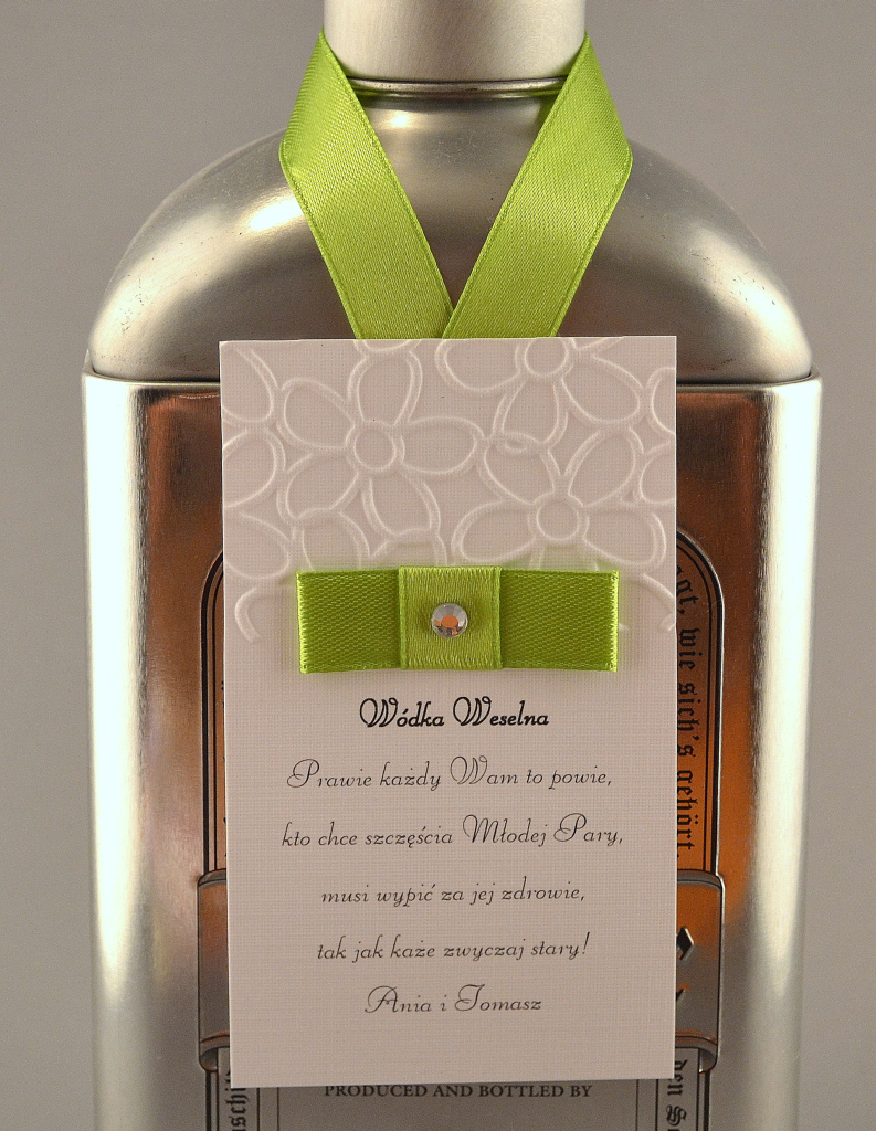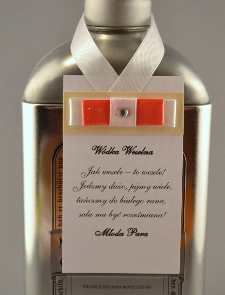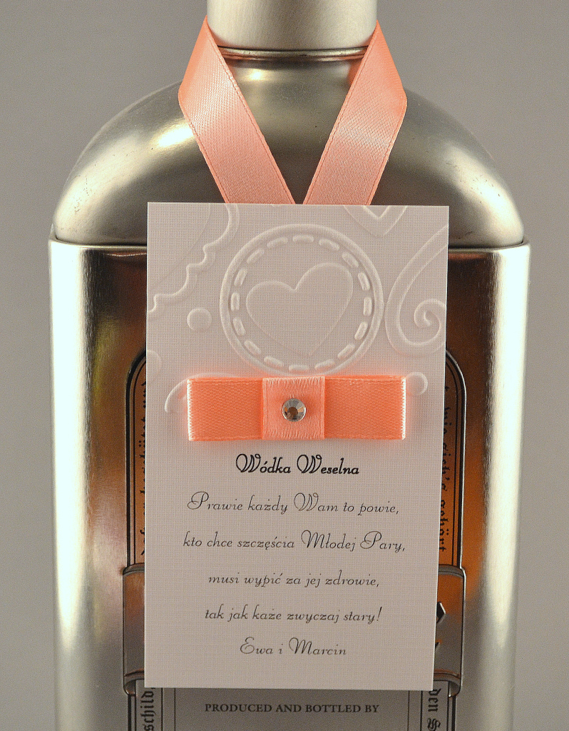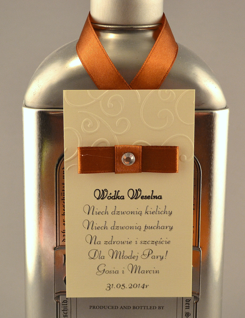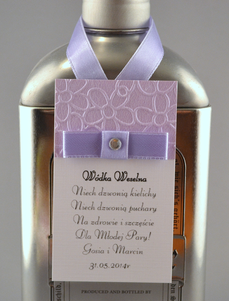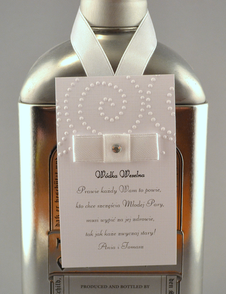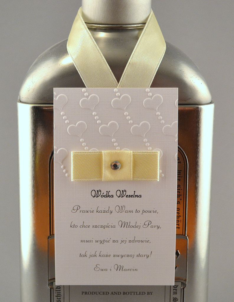 Eleganckie i gustowne zawieszki na wódkę z tłoczeniami, ozdobią każdą butelkę wódki weselnej. Wysokiej jakości papier o gramaturze 246-250 g/m2. Rozmiary zawieszek to 10cm x 6cm. Istnieje możliwość umieszczenia imion i daty ślubu na zawieszce, jak i zmiany treści wierszyków oraz umieszczenia własnych.