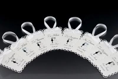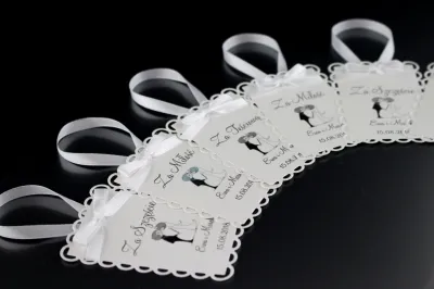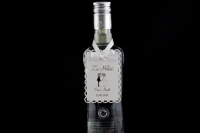 Eleganckie i przyciągające wzrok zawieszki na wódkę weselną, które ozdobią każdą butelkę wódki na waszym weselu. Obie warstwy papieru z którego wykonana jest zawieszka są z wysokiej jakości białego papieru o gramaturze 246-250 g/m2. Rozmiary zawieszek to 10cm x 6cm. Oczywiście Istnieje możliwość umieszczenia imion i daty ślubu na zawieszce, jak i zmiany treści wierszyków oraz umieszczenia własnych.