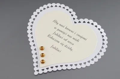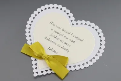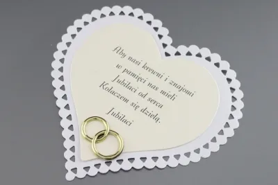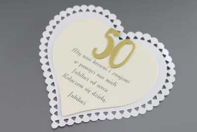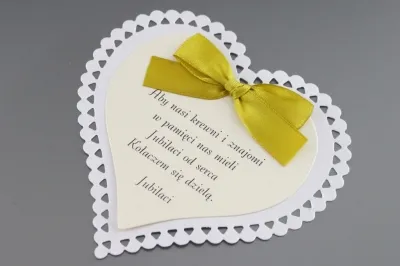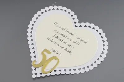 Etykiety na ciasto z okazji złotych godów. Format serca o wymiarach 10 cm x 10 cm. Wykonana z 2 warstw papieru metalizowanego dolnej białej i górnej kremowej. Do wyboru 6 wersji etykiety.